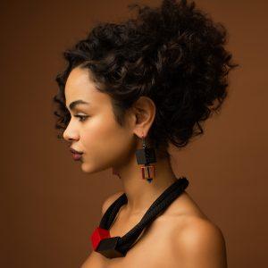 Geometric drop earrings featuring bronze and black aluminum squares with hematite beads. Asymmetric design creates a contemporary edge.