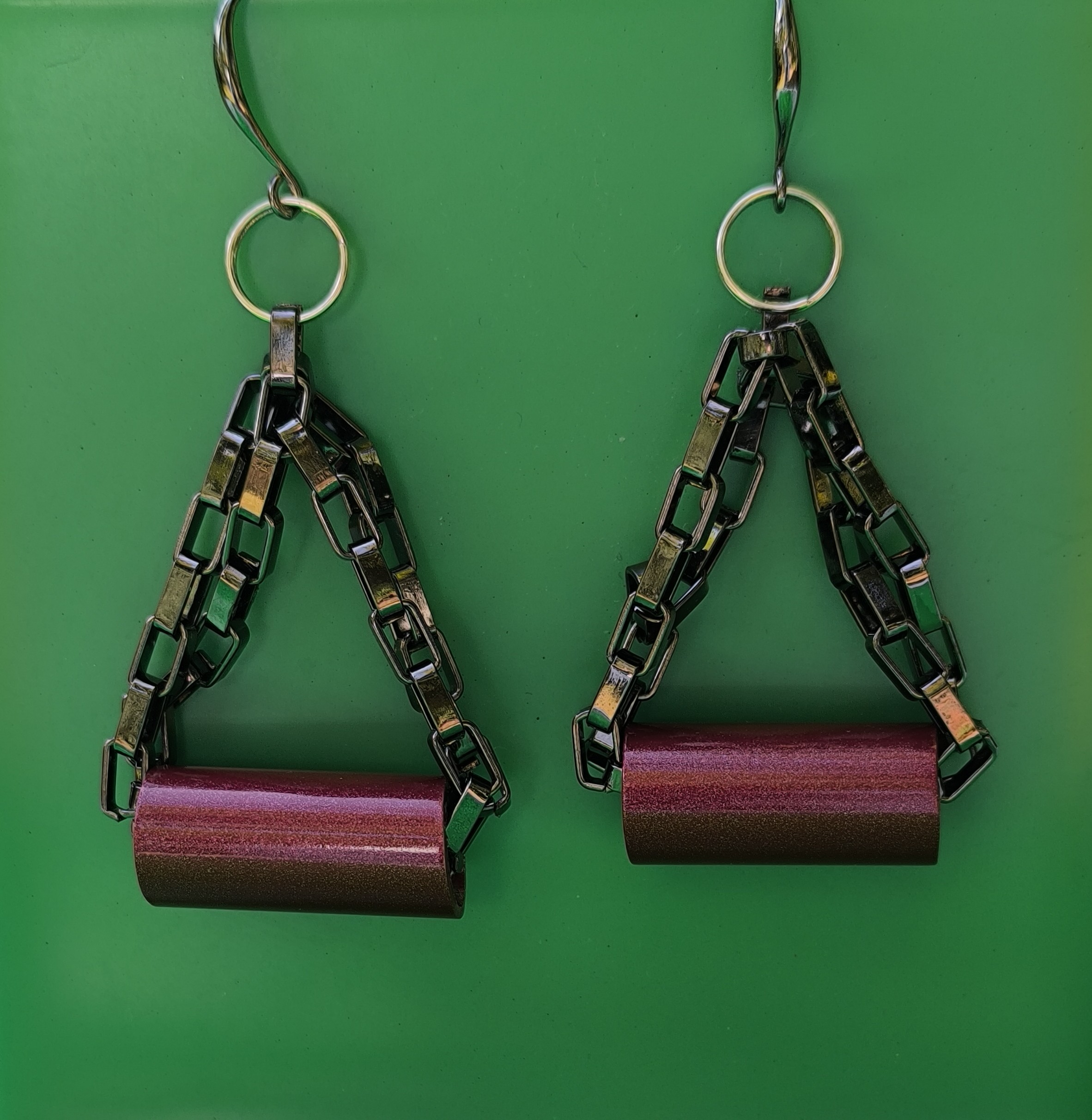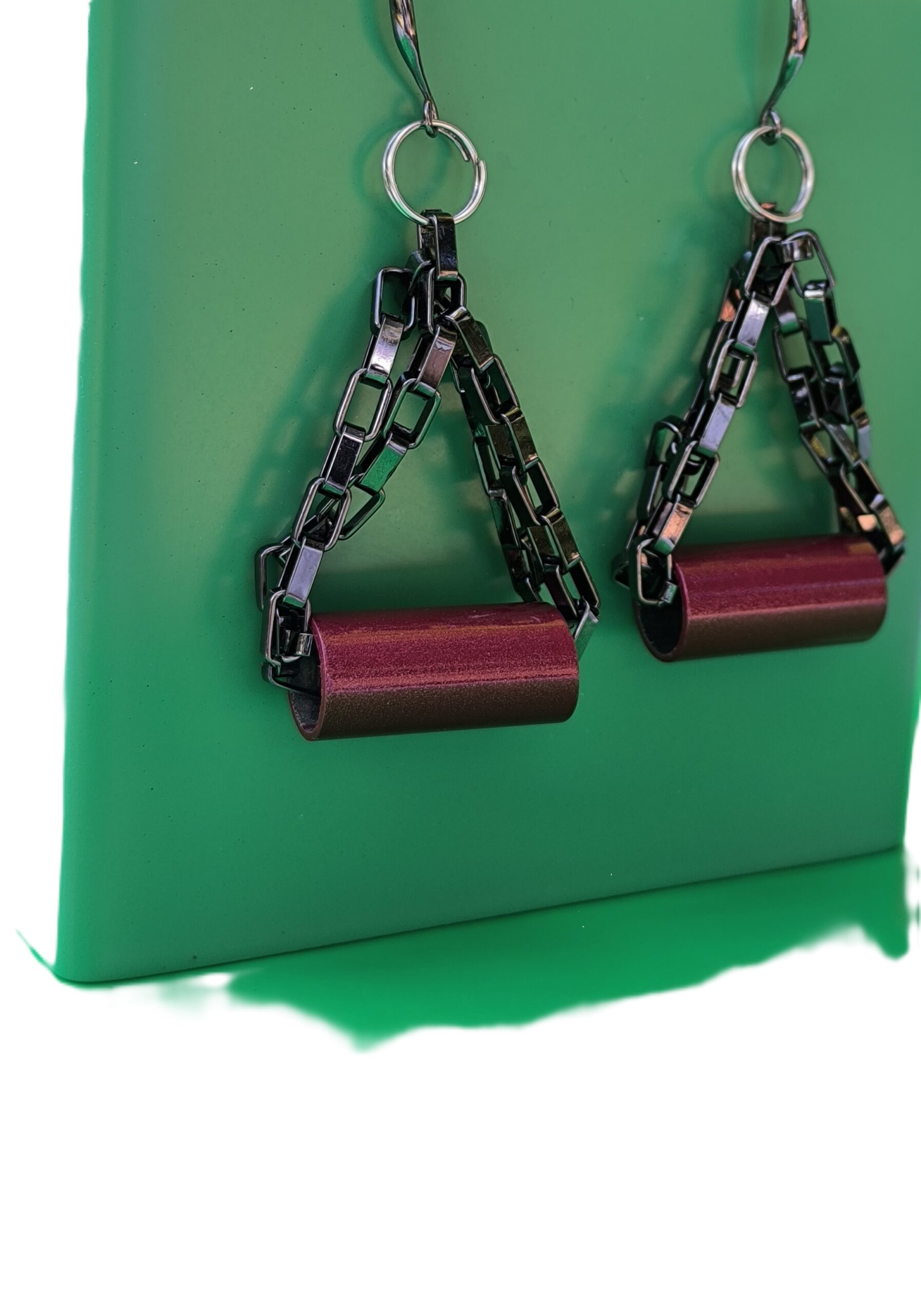 The Burgundy Eclipse Earrings bring a sleek geometric edge with a seductive metallic glow that catches the light with every move.