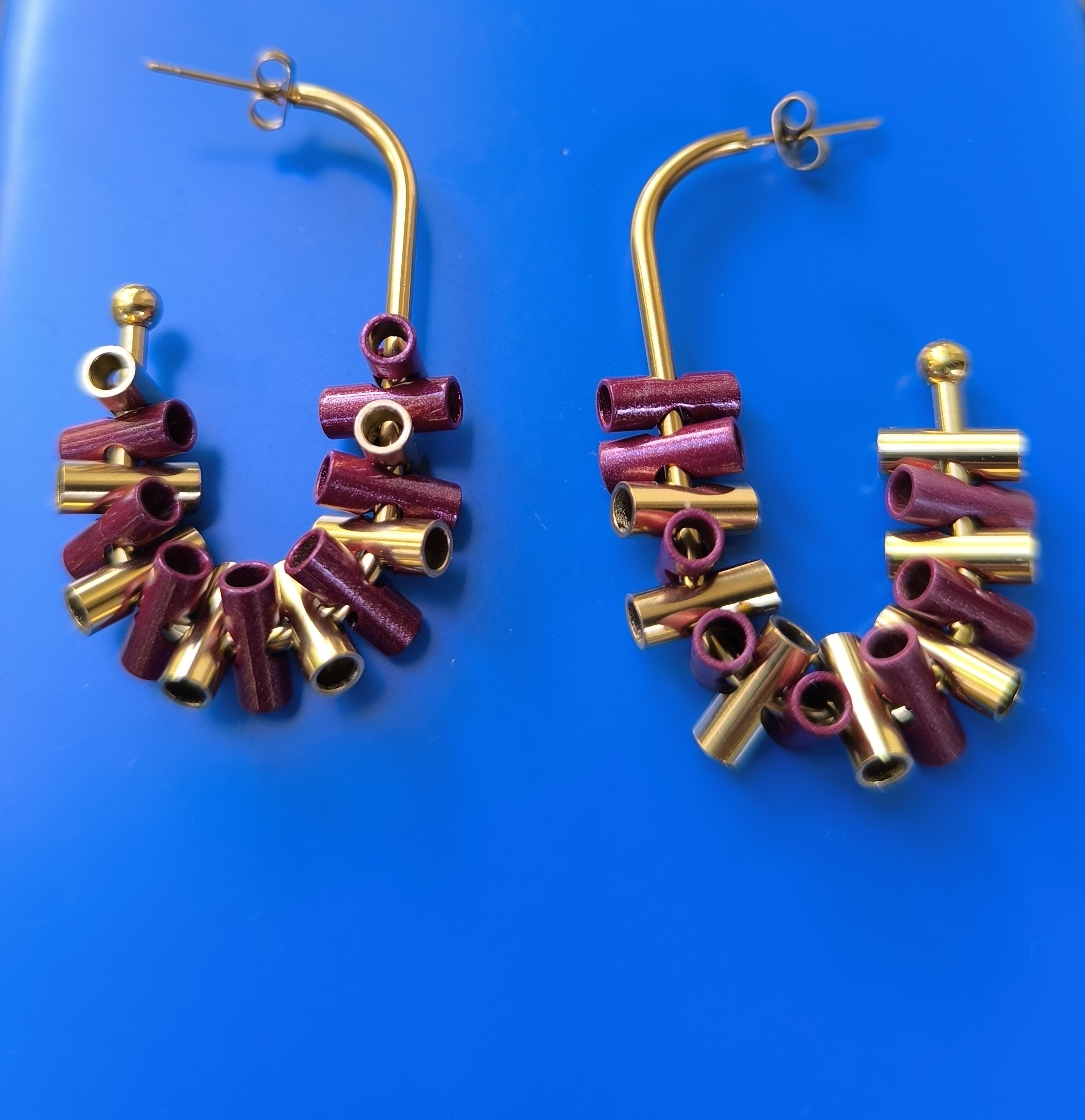Each earring features cascading ruby-dark red and gold barrels arranged around a sleek golden arc. Their unique construction creates subtle sound and movement, making them as expressive as they are beautiful.