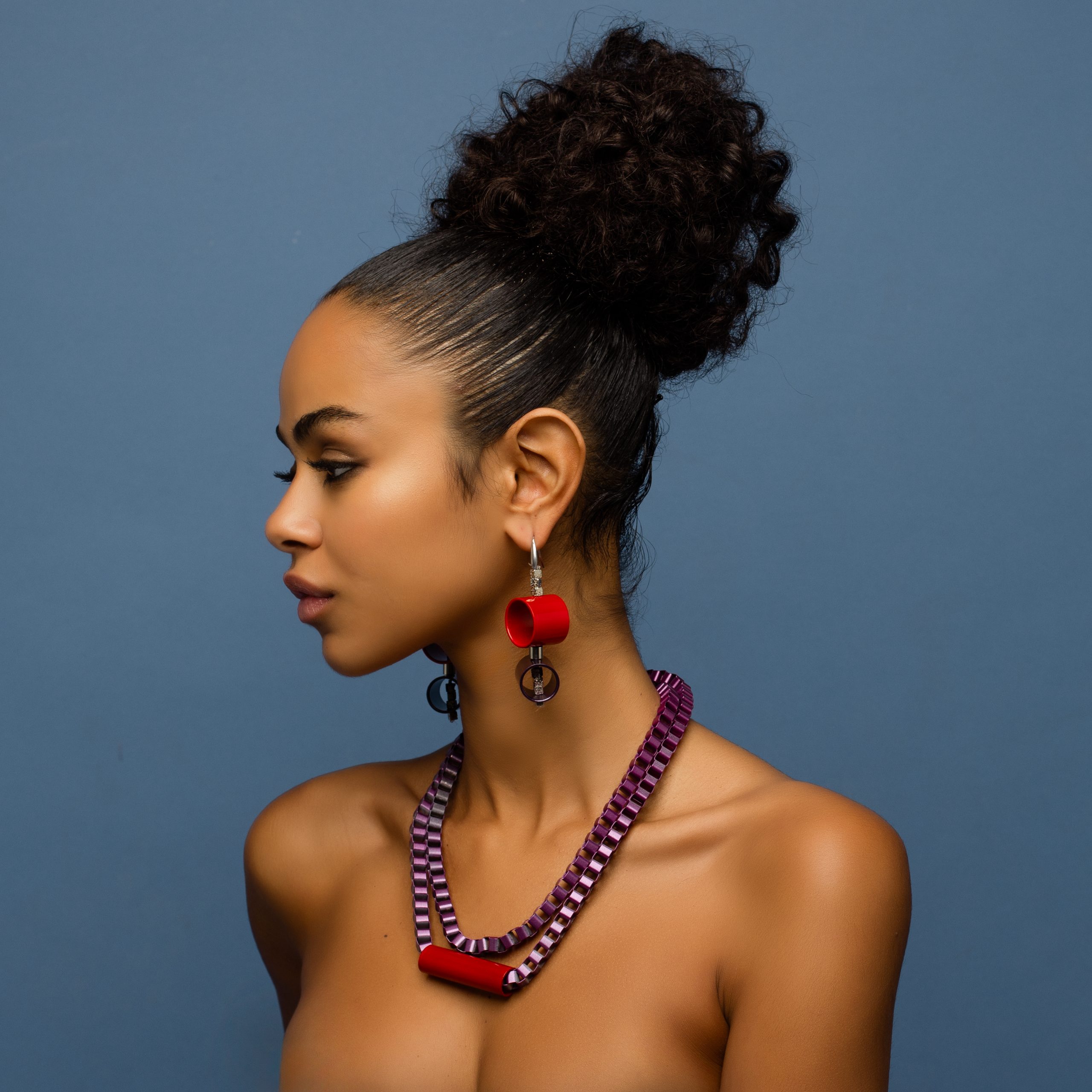 Statement drop earrings with red and purple aluminum cylinders. Geometric design enhanced with silver-toned hardware for modern elegance.