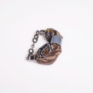 Striking bracelet from brown velvet fabric with paisley pattern and brushed aluminum accent.