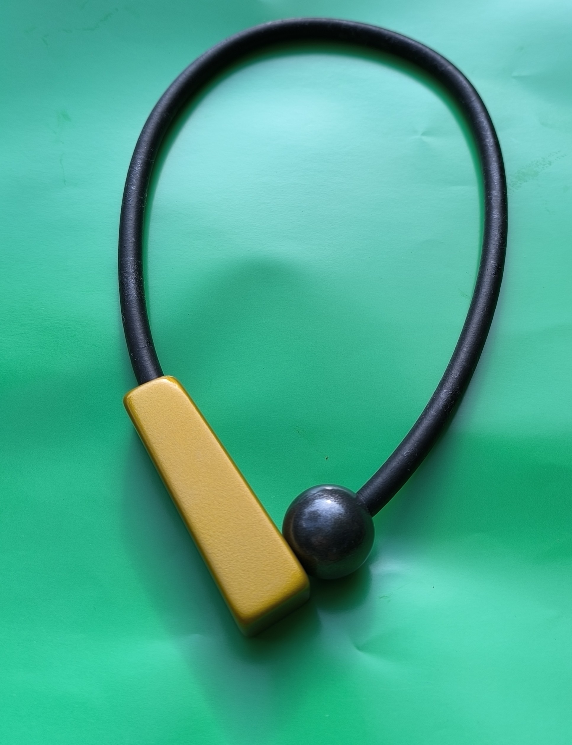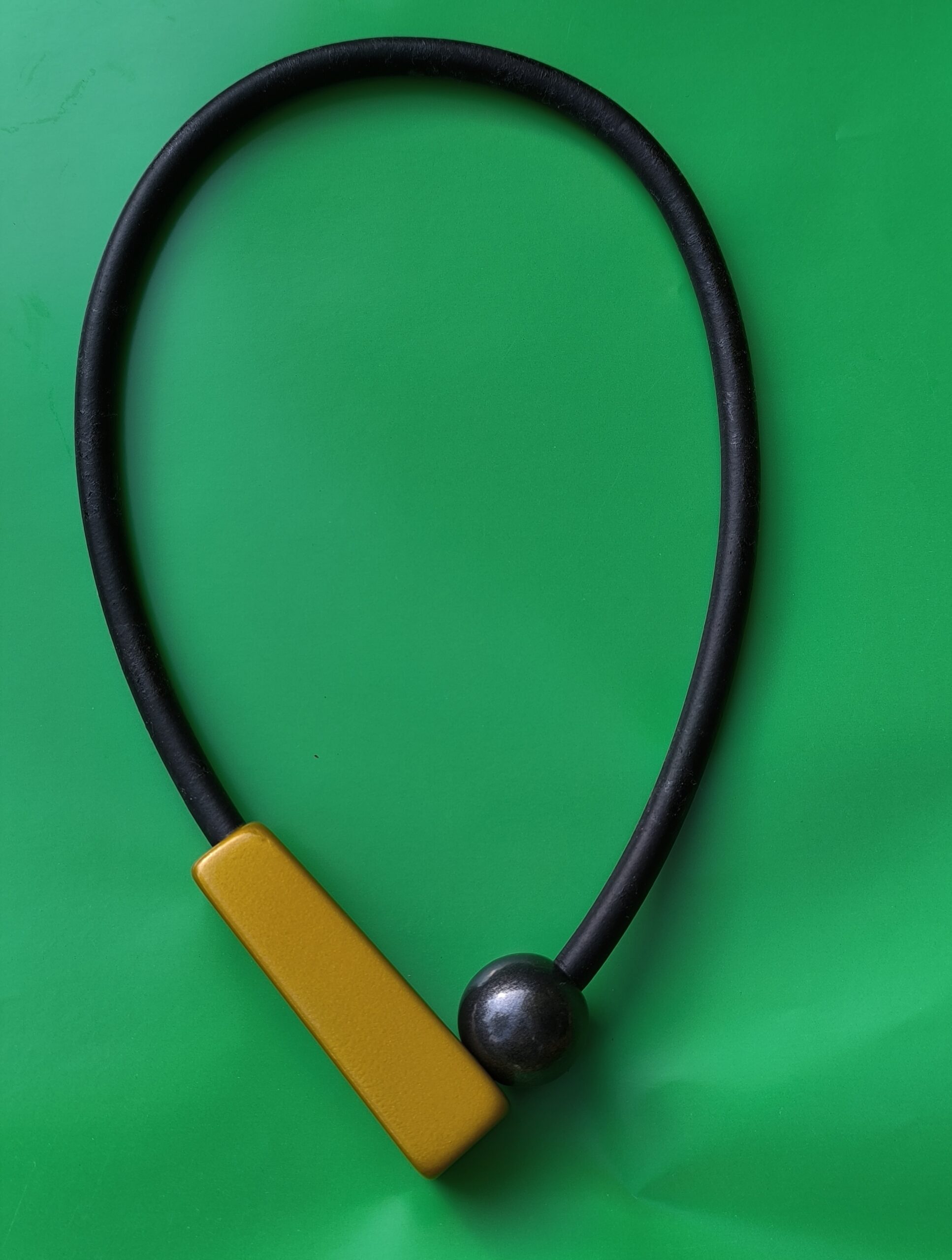 The Golden Glow Geometry necklace is a contemporary minimalist statement piece designed for those who love clean lines with a bold artistic touch. Crafted with a smooth black rubber cord, it features a geometric golden bar balanced with a dark metallic sphere, creating a striking colour and shape contrast.