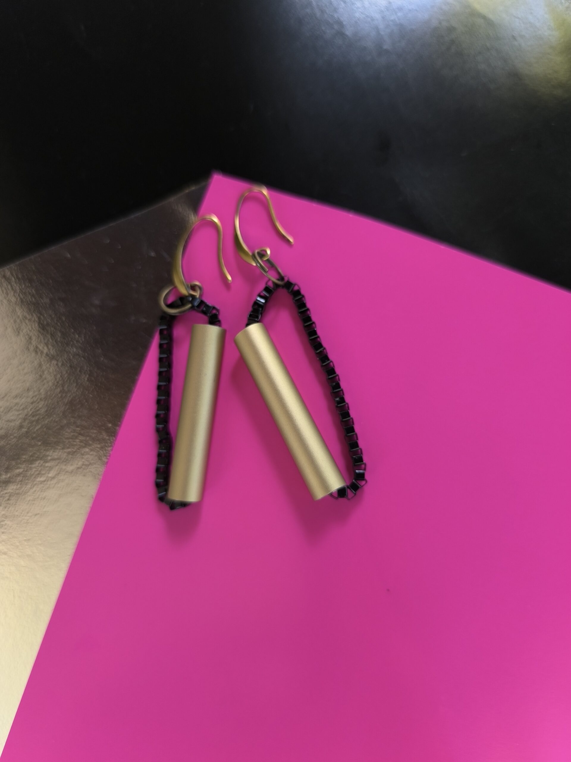 Meet the Golden Sparkline matte Earrings — a modern geometric design crafted for lovers of clean lines and understated impact. The gold matte aluminum bar brings a warm metallic glow, beautifully contrasted by a black chain loop that creates movement and architectural balance. Lightweight and versatile, these earrings transition from daytime effortless chic to evening urban elegance with ease.