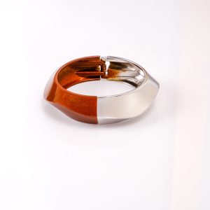 This elegant bangle bracelet pairs high-polish aluminum with a rich mahogany brown element in a sleek, architectural design reminiscent of exotic orchid species. The warm chocolate tone creates dramatic contrast against the reflective metallic surface, evoking the sophisticated color palette found in rare brown orchid varieties. The smooth, curved silhouette sits comfortably on the wrist while making a bold statement, bringing the exotic elegance of tropical blooms to contemporary jewelry design. A versatile piece that transitions effortlessly from day to evening wear.