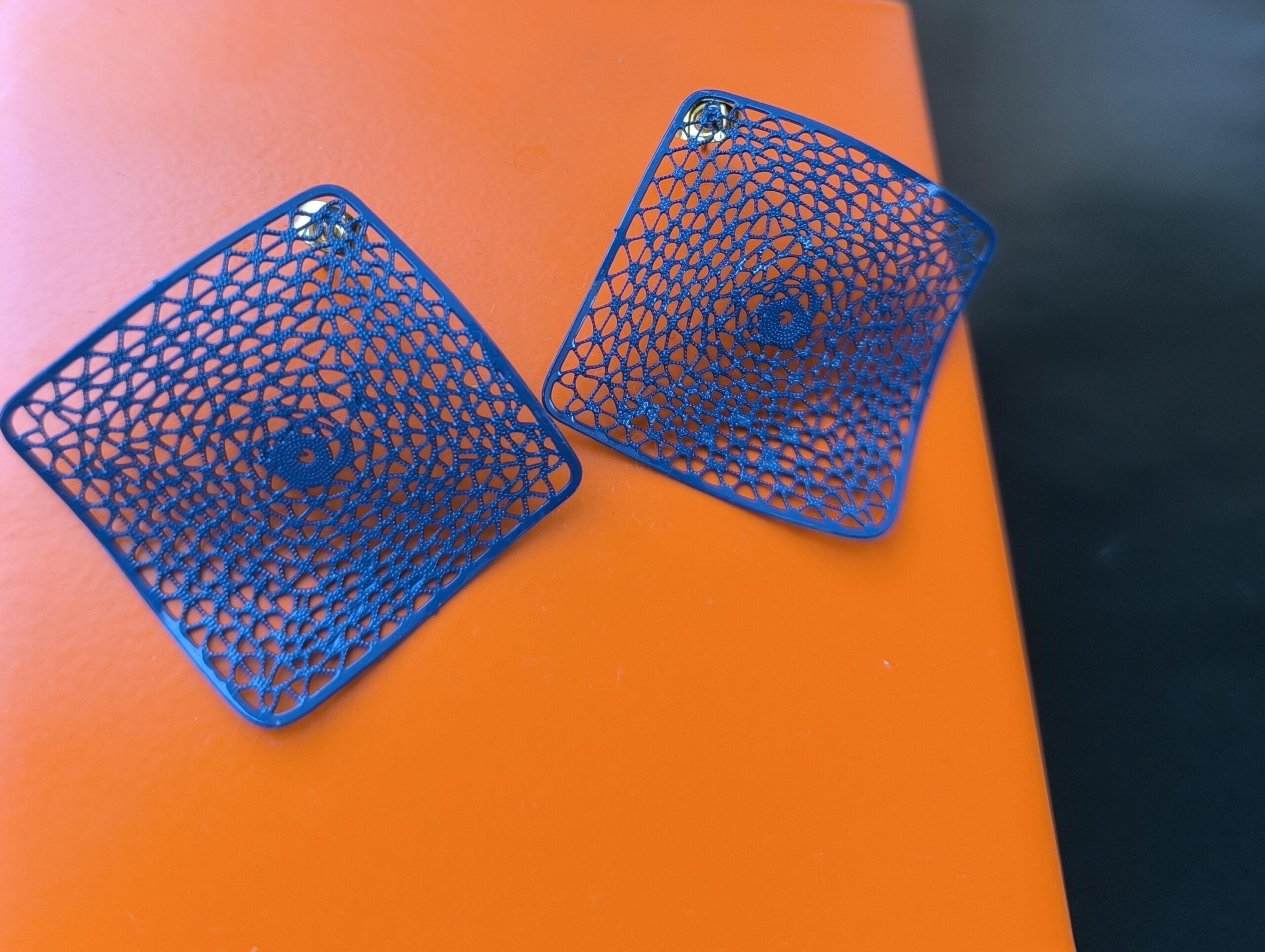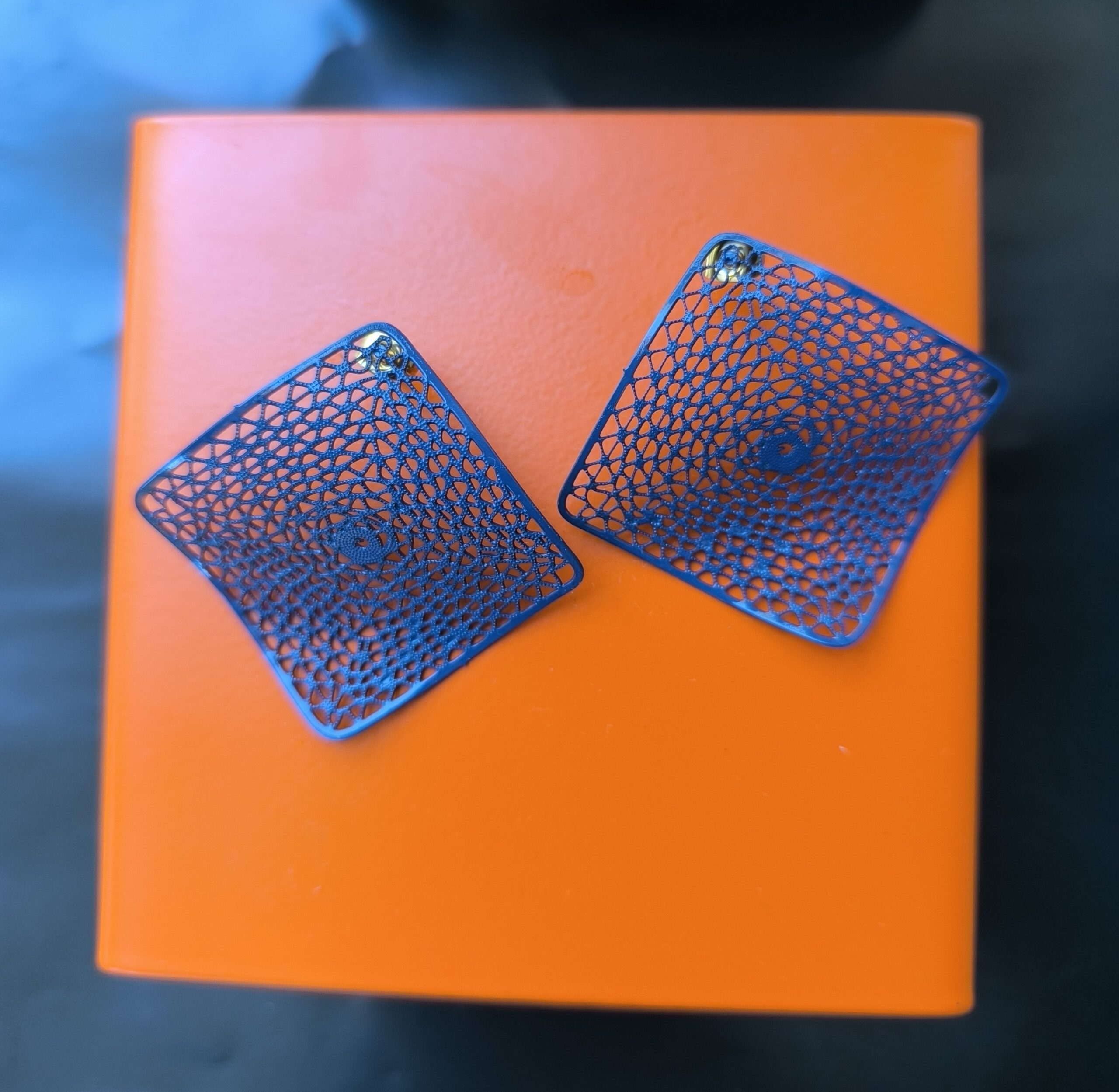Designed with an intricate open-lace pattern, these sculptural square studs add a refined contemporary edge to any outfit. The rich royal-blue lacquer offers a polished high-gloss finish that elevates both everyday and evening styling.