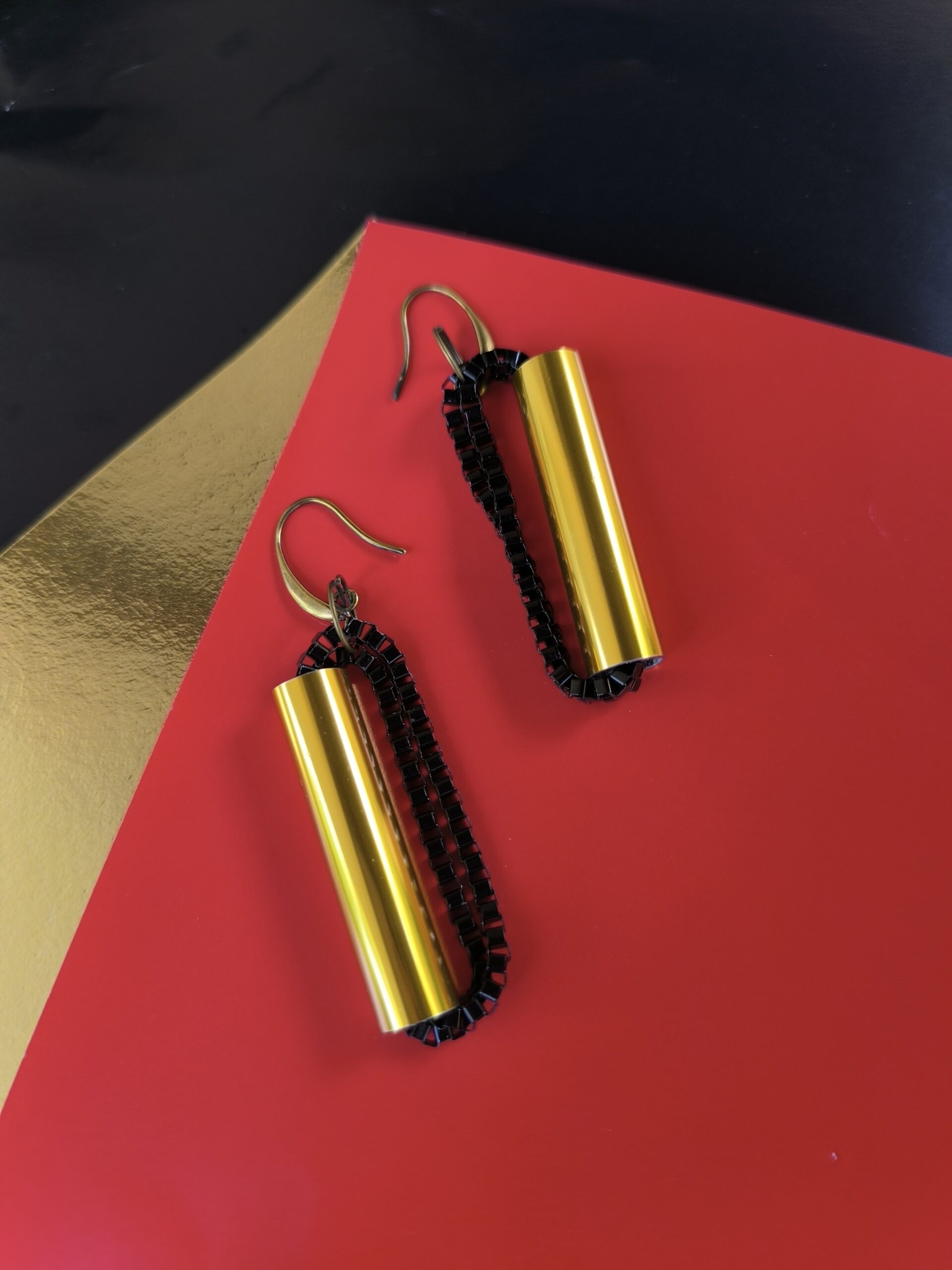 These handcrafted statement earrings combine sleek modern lines with bold contrast. Featuring gold cylindrical elements paired with a double black chain detail, they offer a unique geometric movement that adds elegance and edge to any outfit. Light in weight yet visually striking, they’re the perfect accessory for both everyday styling and evening looks.