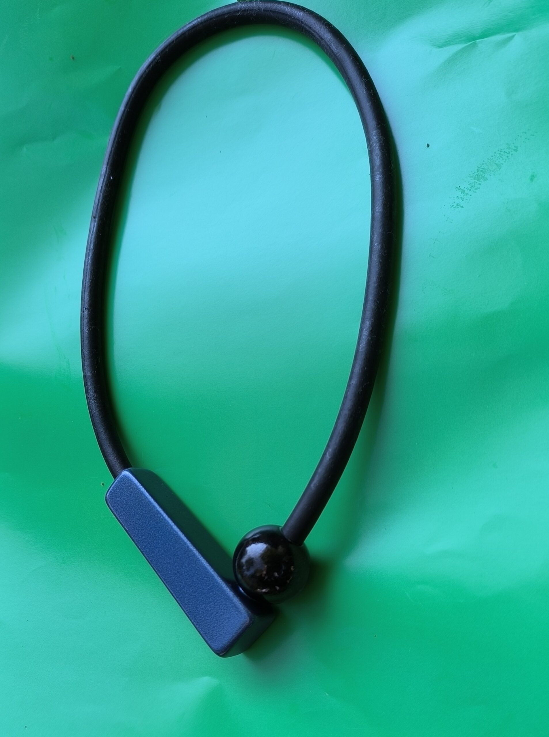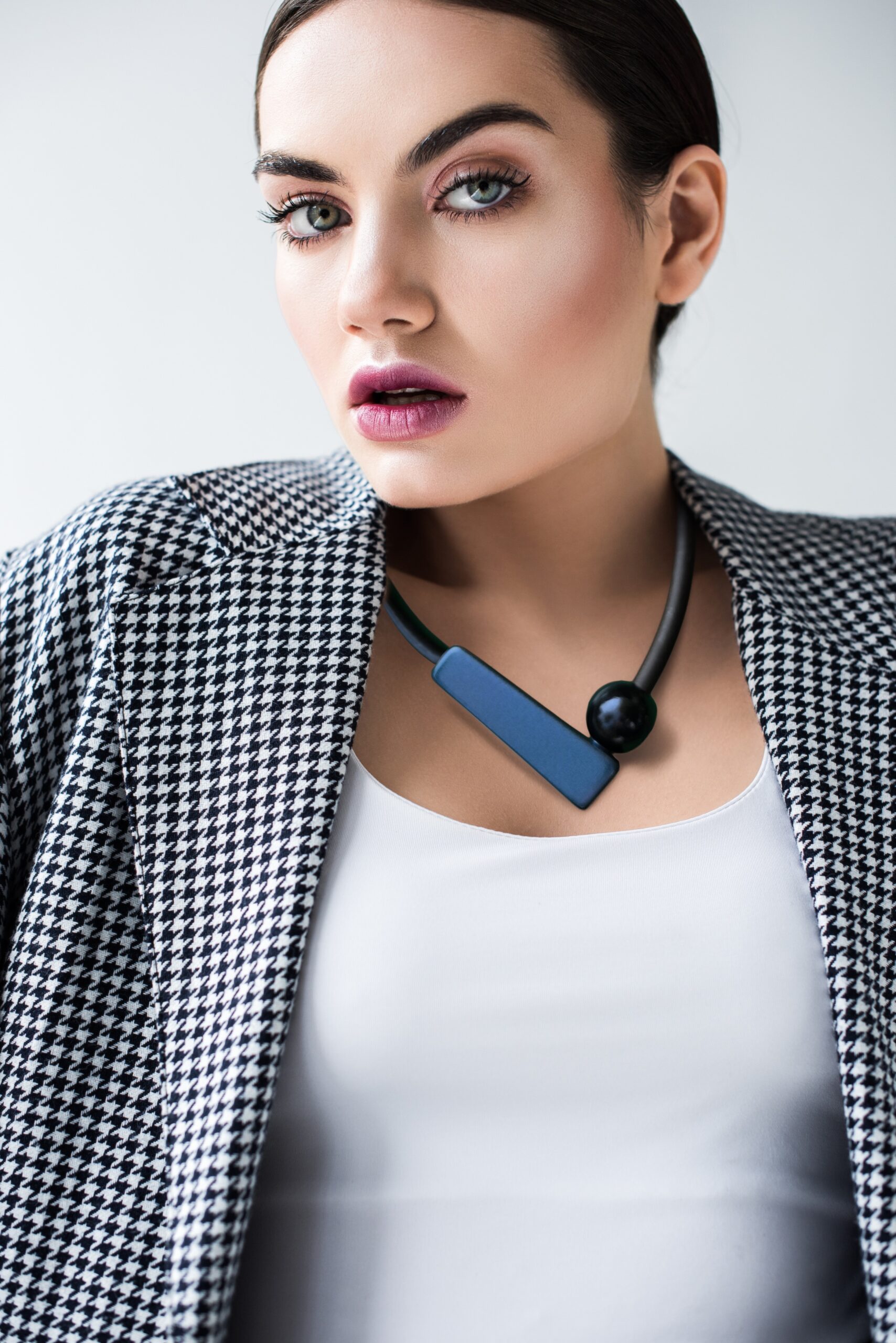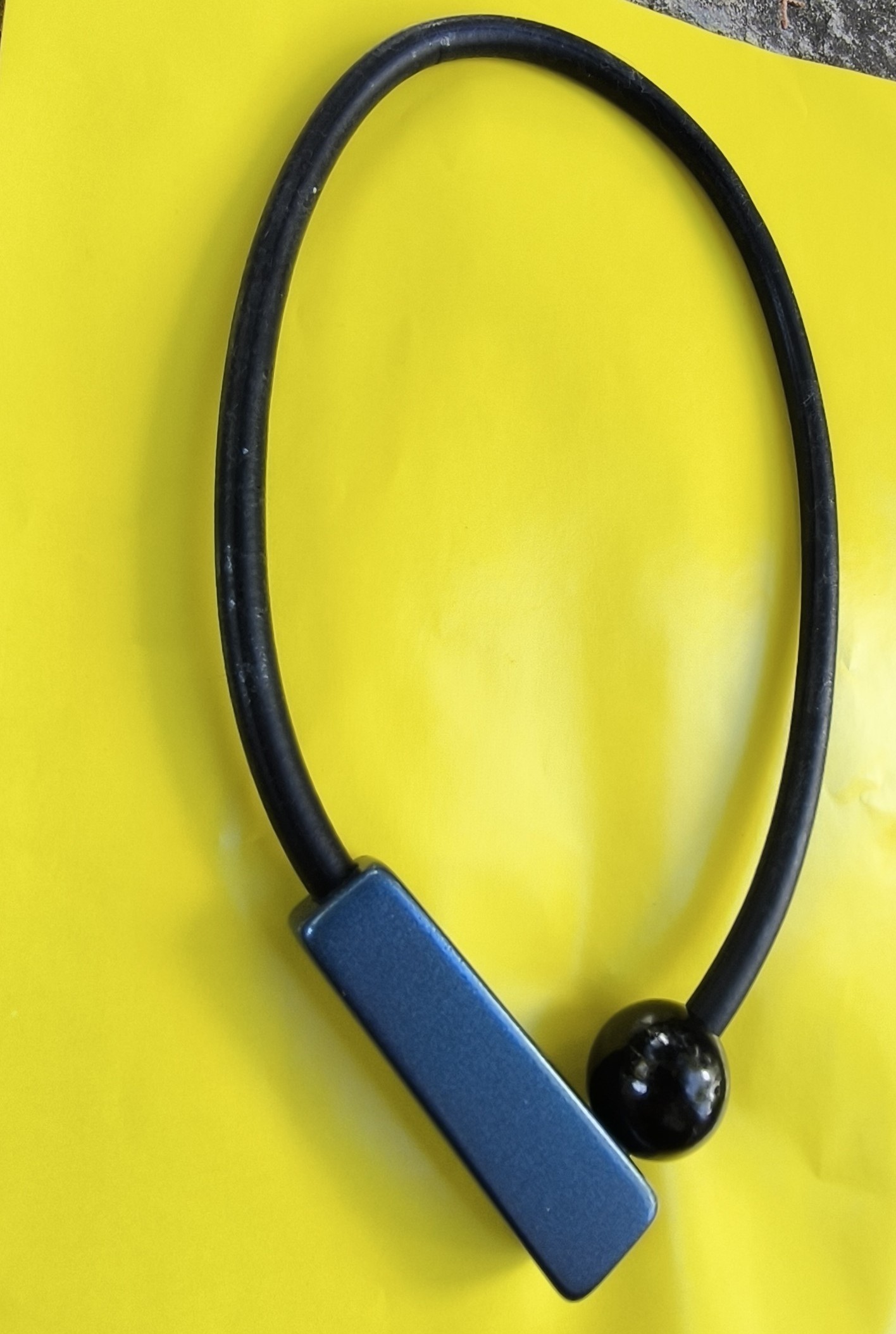 This necklace combines a deep midnight-blue rectangular bar with a glossy black spherical element, arranged asymmetrically on a flexible rubber cord. Lightweight and comfortable, it adds a polished, artistic edge to both casual and elegant outfits.