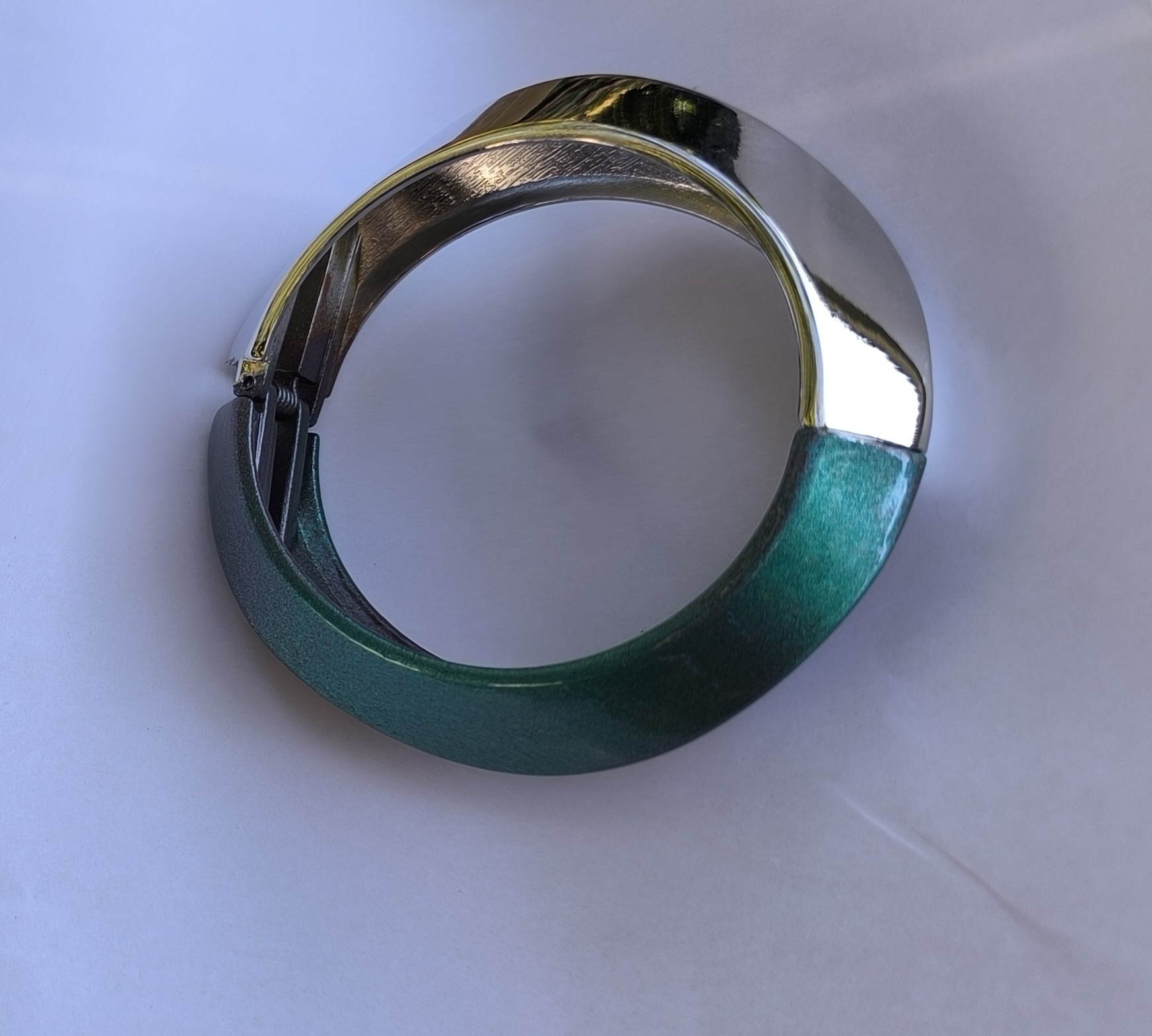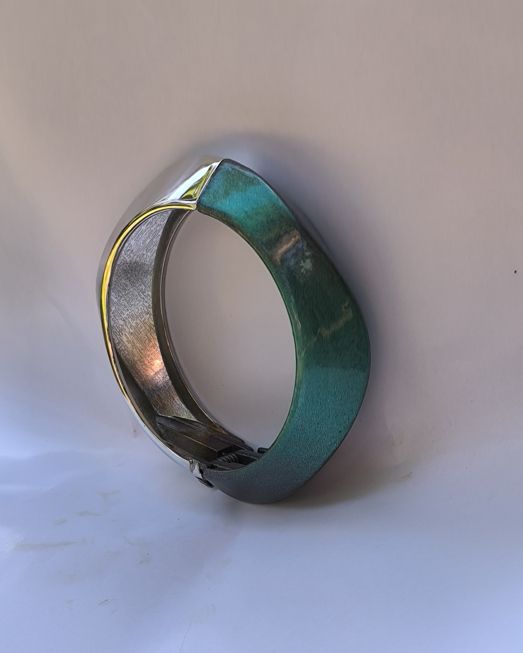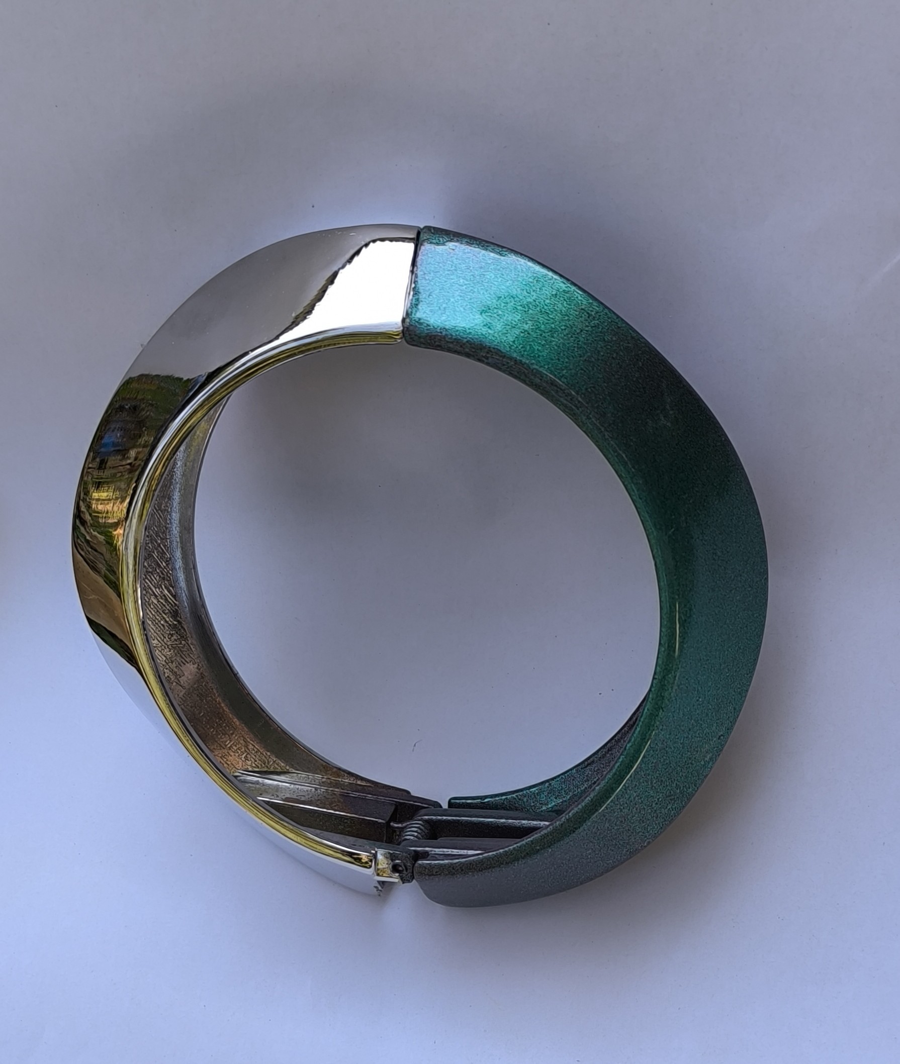 This bold bangle combines a rich emerald with subtle grey undertones—and a high-shine mirror silver finish that catches the light beautifully. Elegant, edgy, and contemporary, it transitions effortlessly from day wear to evening glamour.