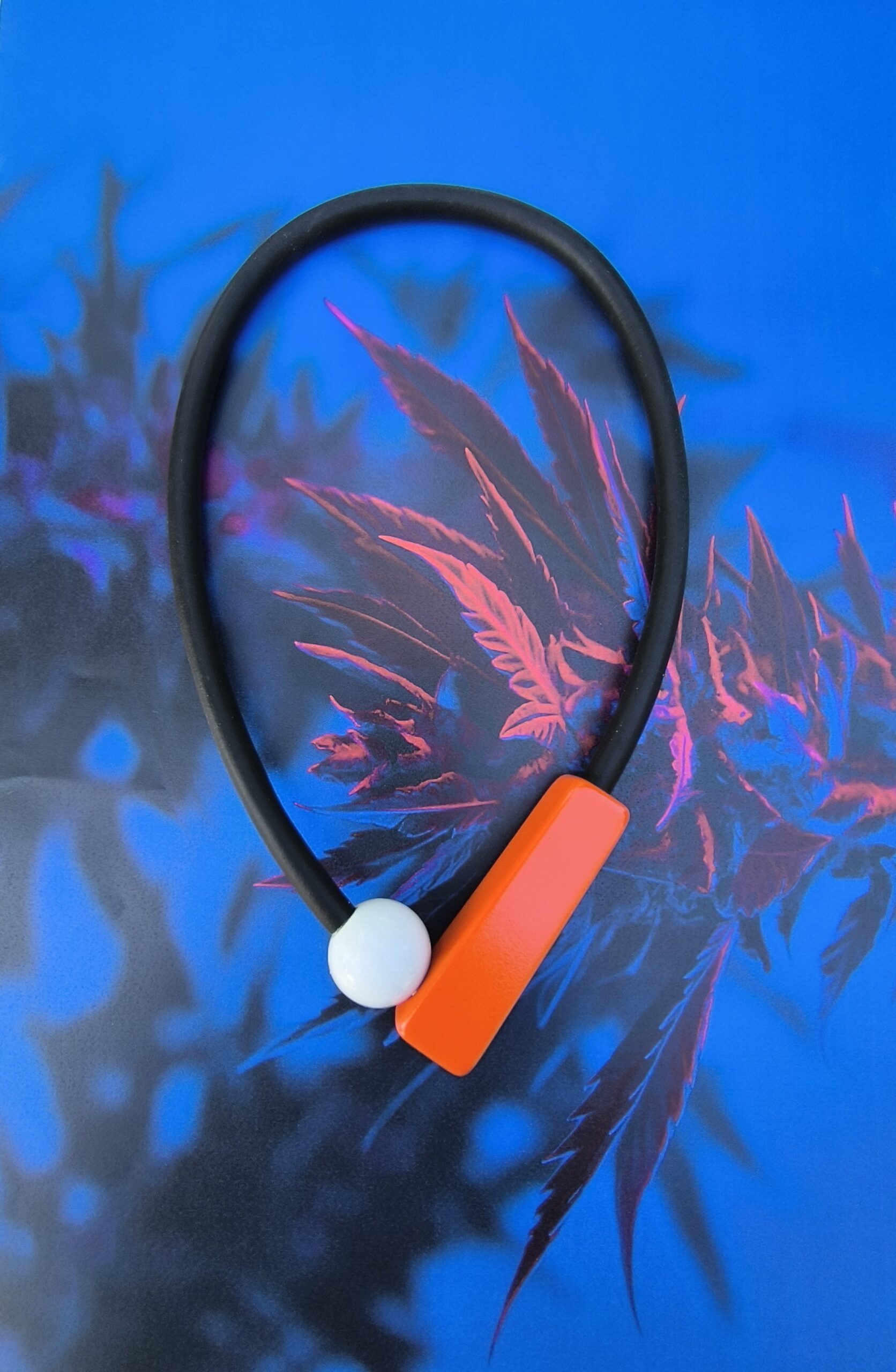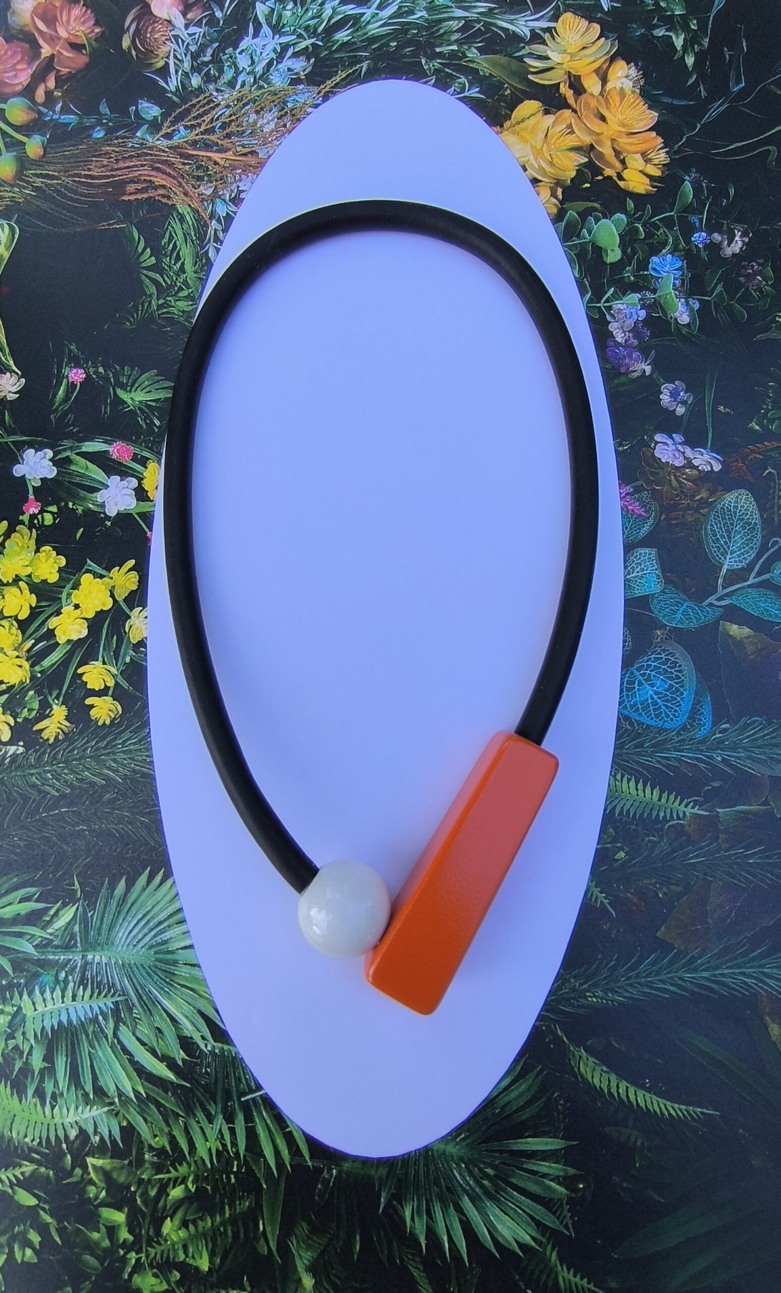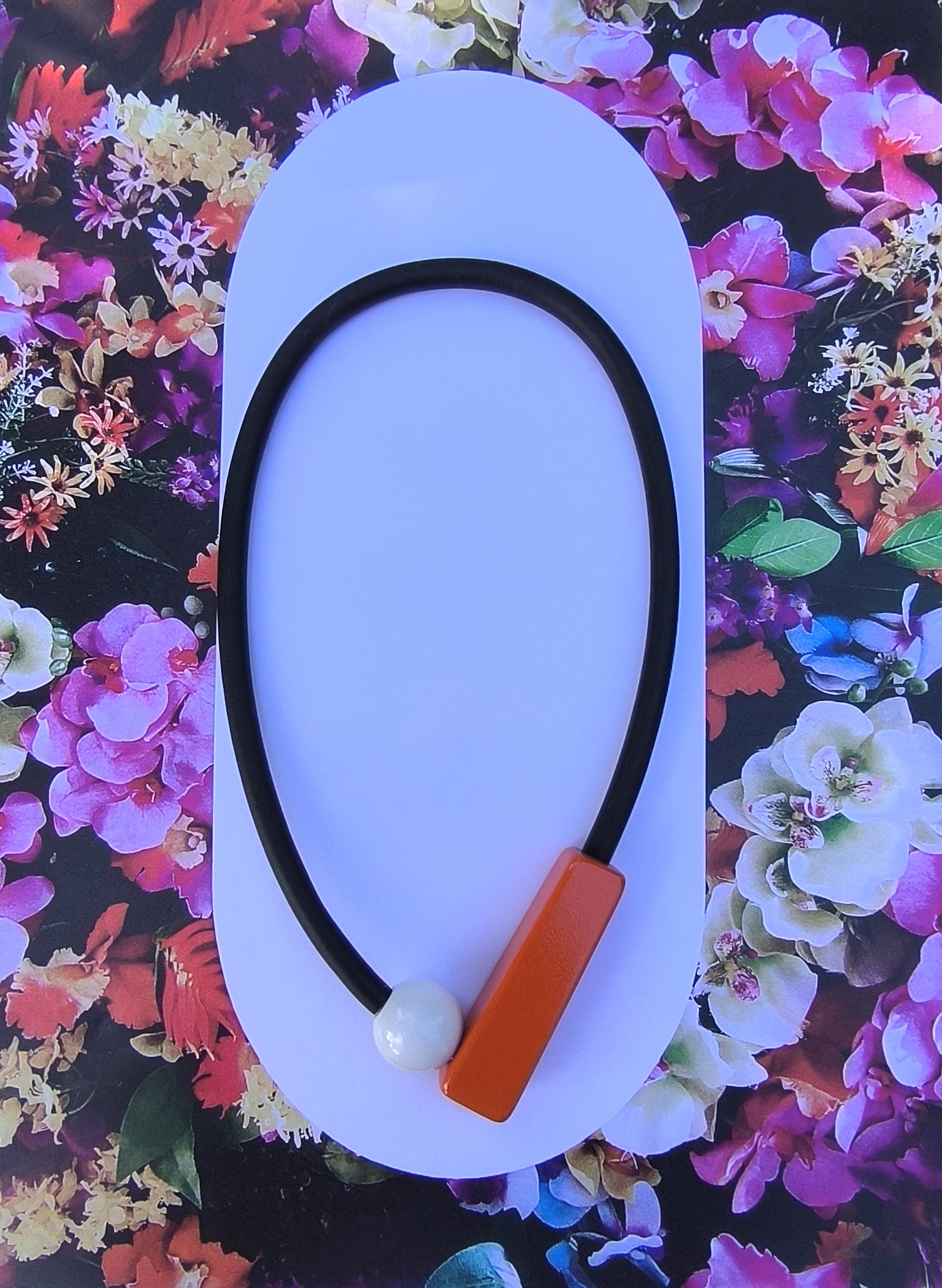 Balancing an orange rectangular bar with a white glossy sphere, this necklace plays with contrast, form, and color harmony. Set on a soft black rubber cord, it’s lightweight, flexible, and comfortable enough for all-day wear.