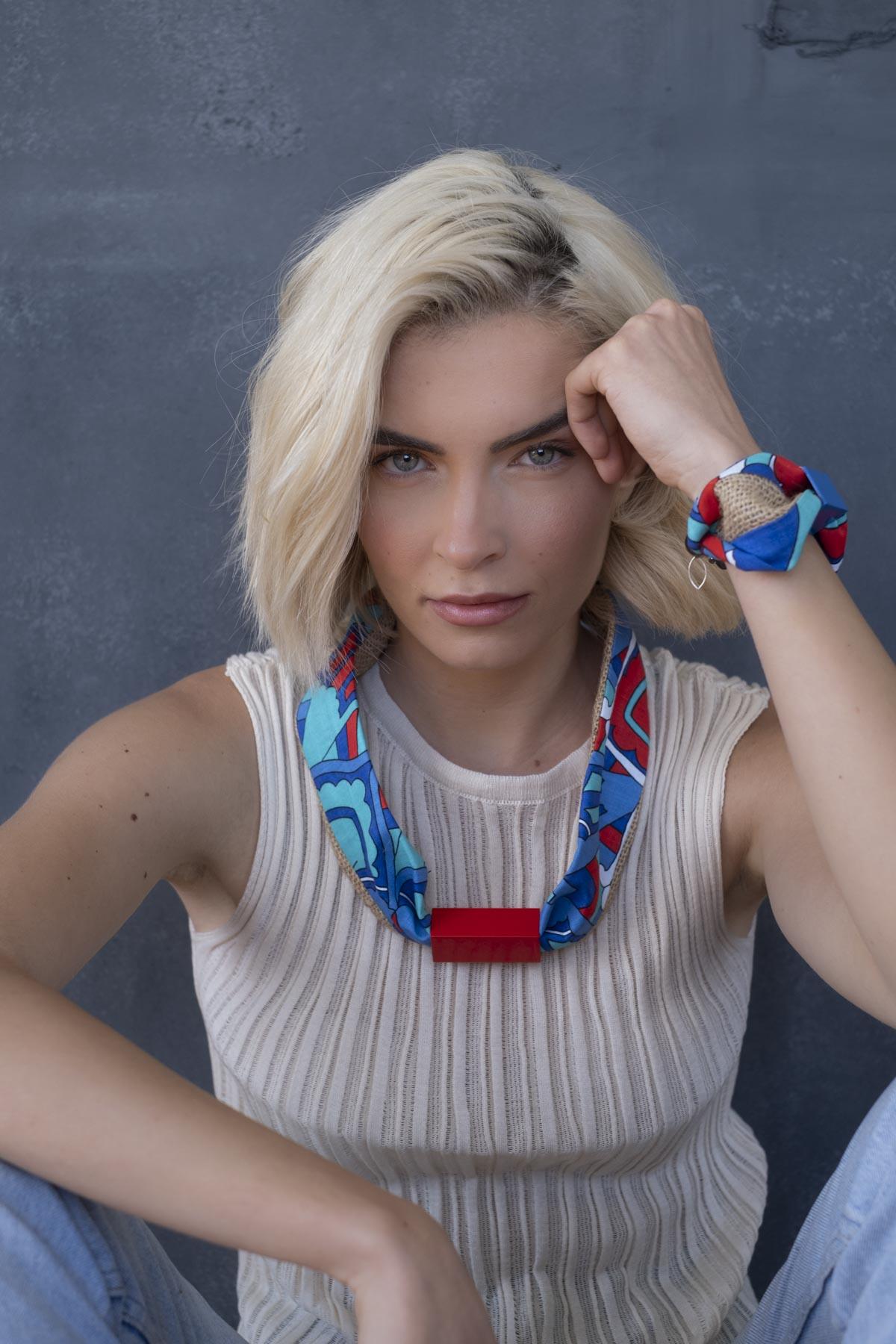 PWH1 Geometrical and abstract colorful designs with sand colored burlap and red aluminum cube. Elevate your wardrobe with a touch of playfulness.