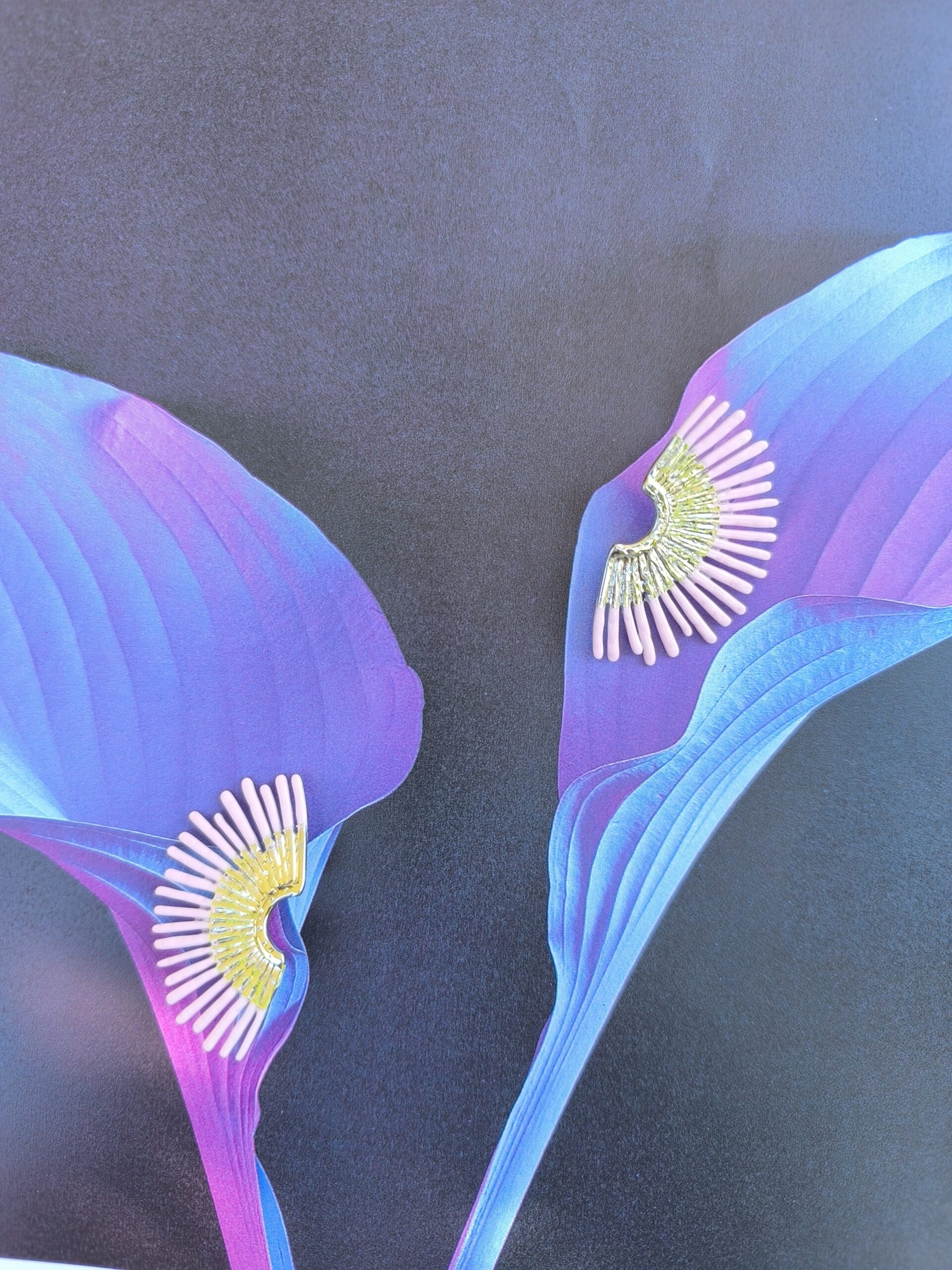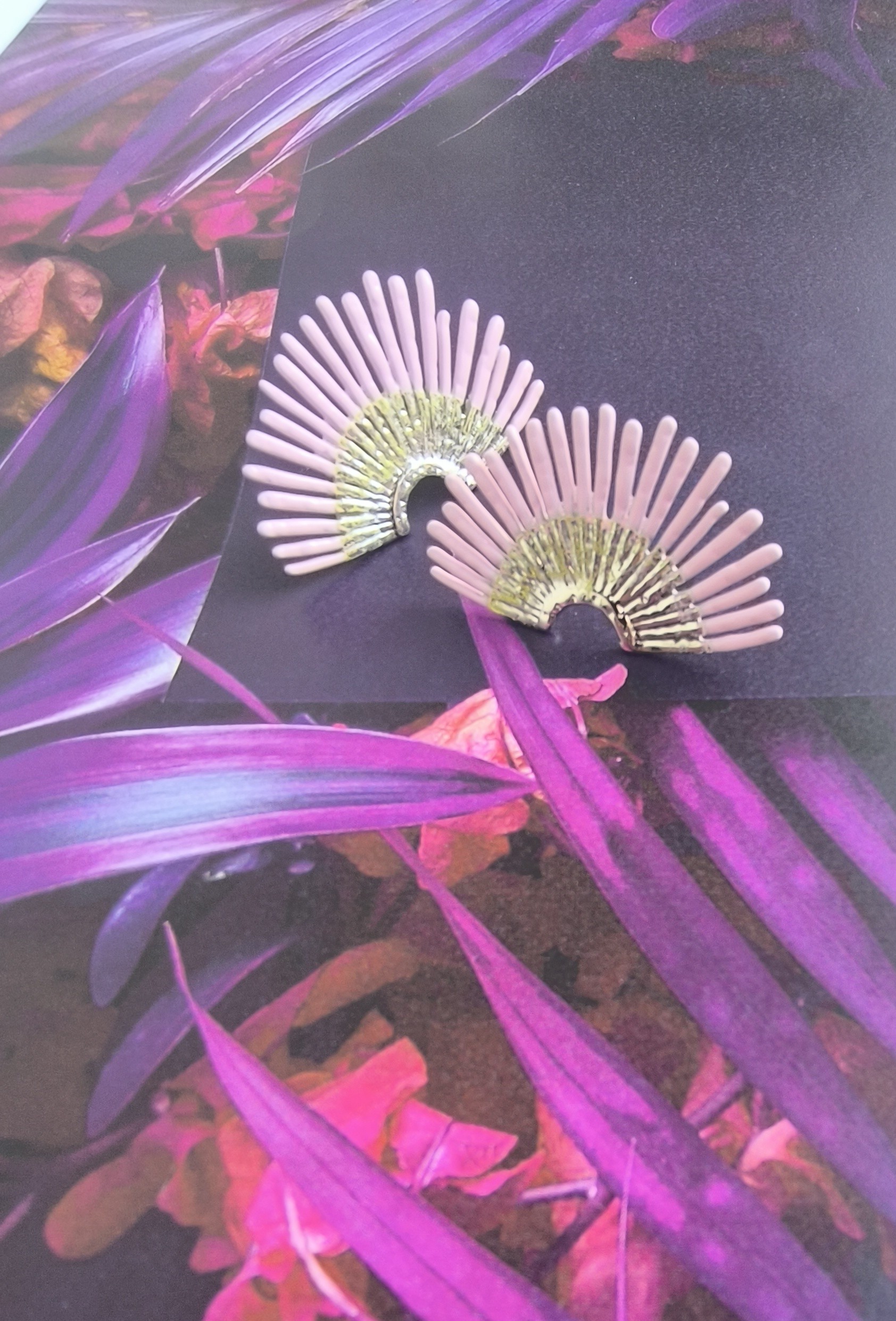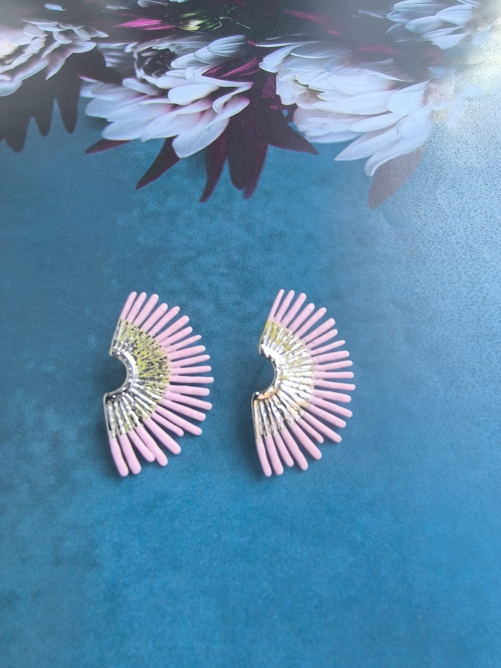 The Pink Orchid Spines Earrings are a contemporary statement accessory designed for those who love jewelry with artistic attitude. Crafted from lightweight aluminium, these fan-shaped earrings showcase a radiant blend of pink tones with subtle golden highlights — creating a luminous effect that catches the light beautifully from every angle.