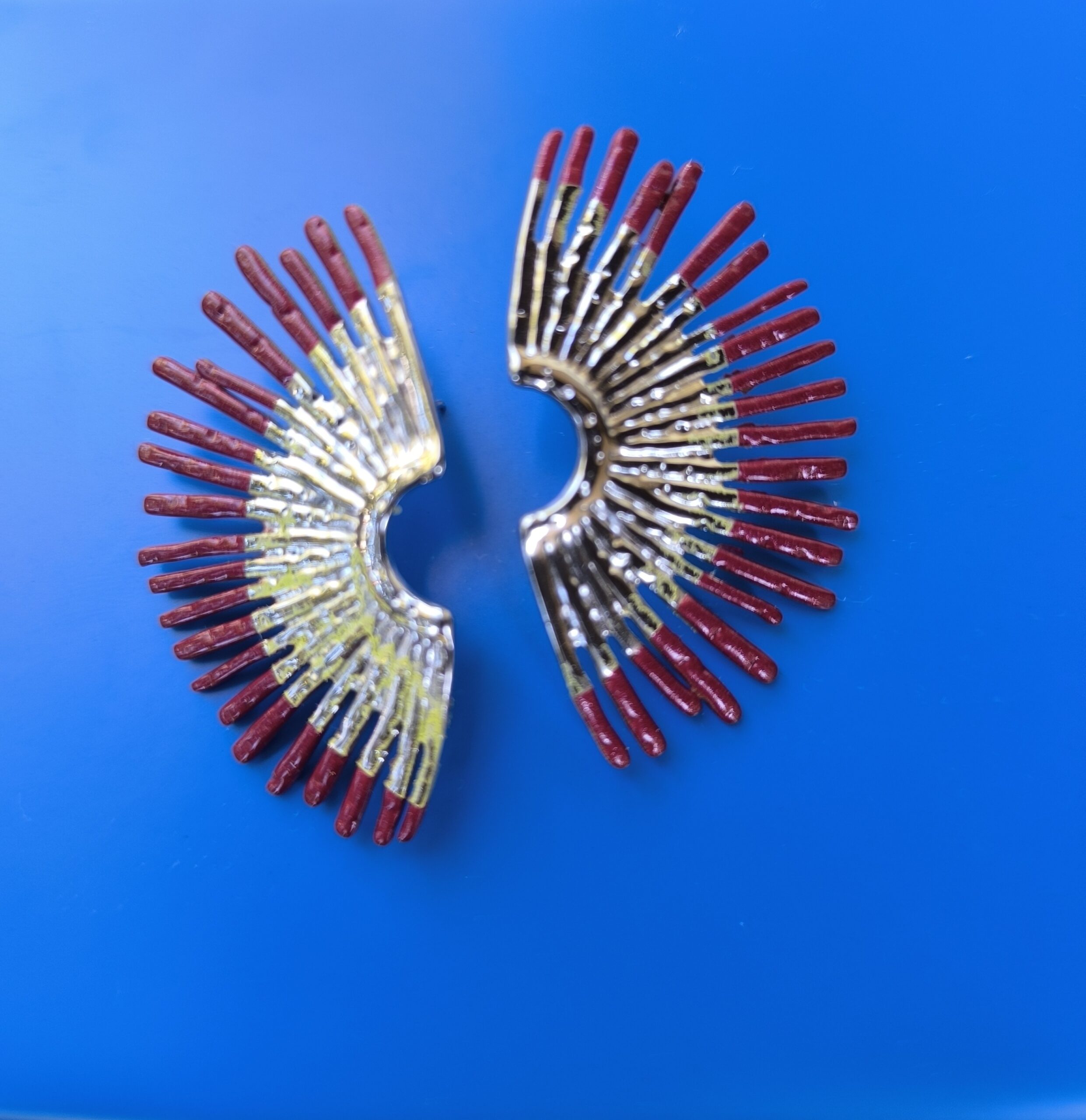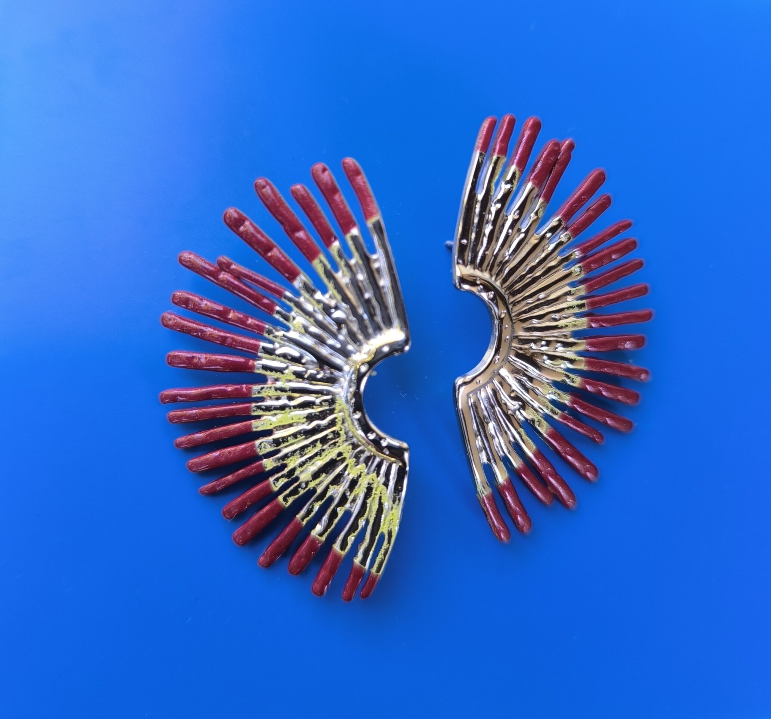 The Scarlet Wing Earrings are designed for women who love impactful accessories with an artistic edge. Crafted from lightweight aluminium, they feature a striking fan-shaped silhouette in vivid red accented with metallic detailing that catches the light beautifully.