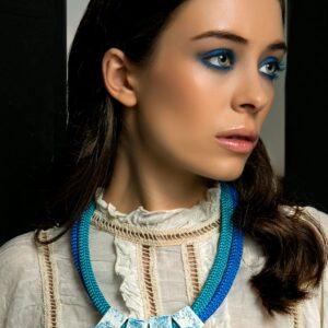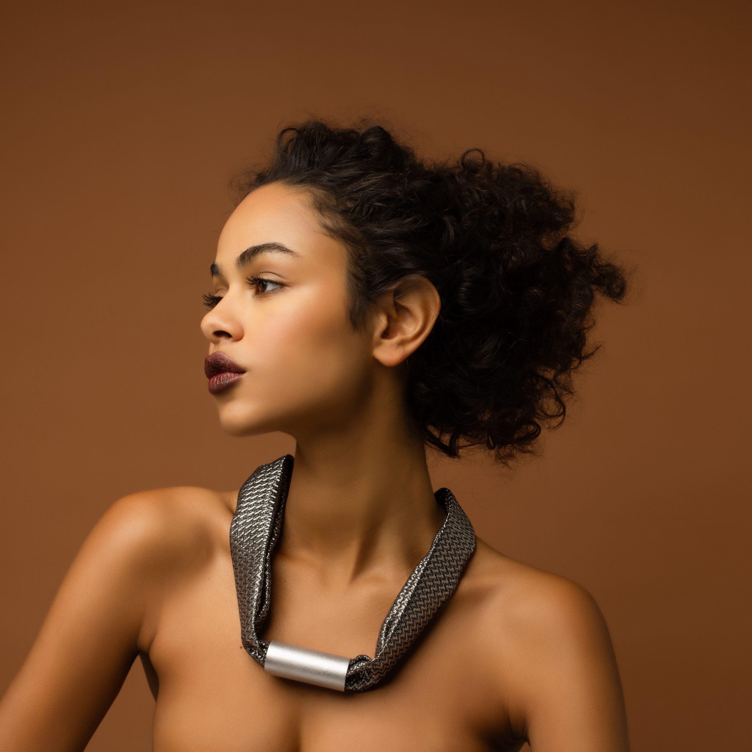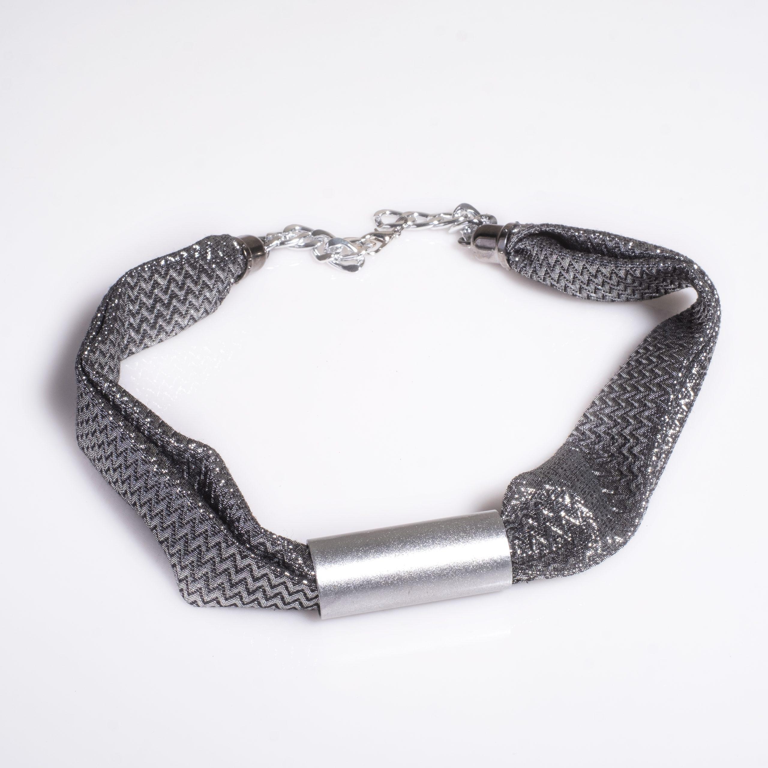 Chic necklace featuring metallic grey textured fabric and aluminum detail. Chain accents add edgy sophistication.