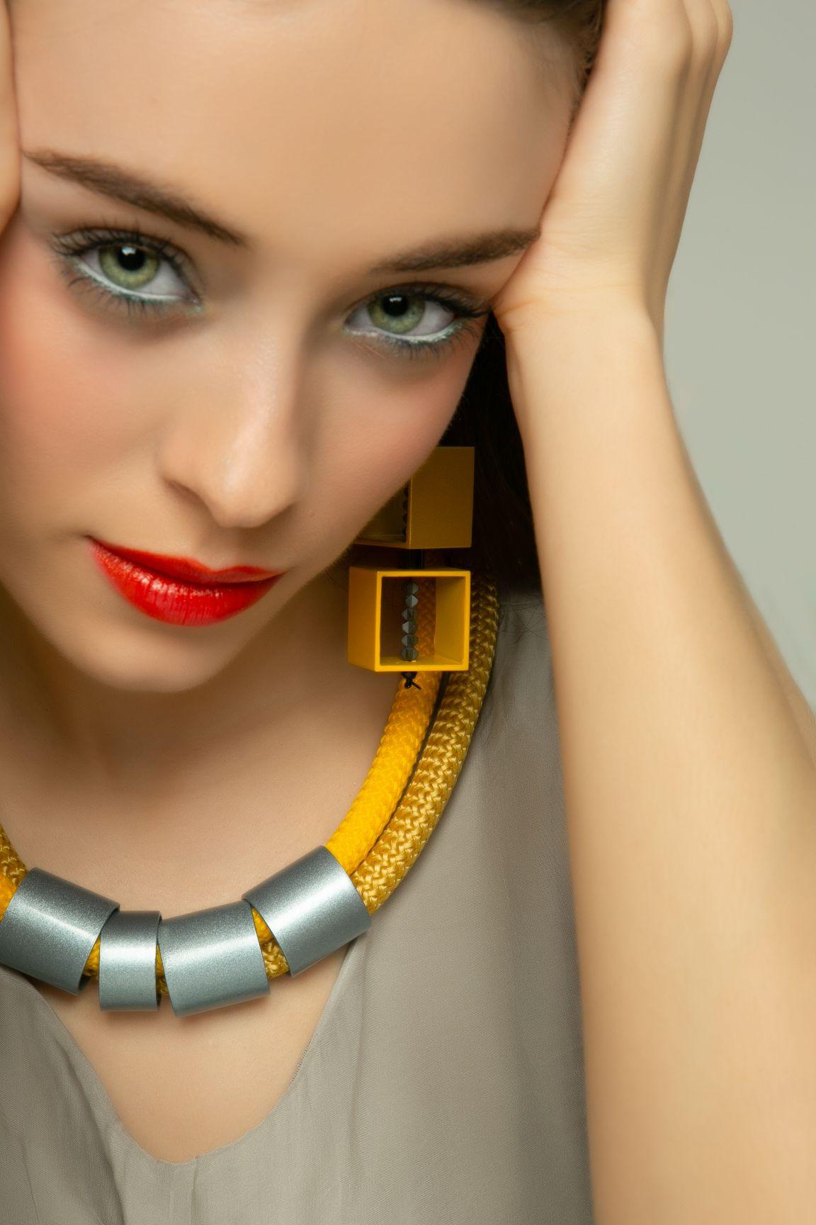 Two climbing ropes with different shades of yellow and four aluminium tubes create this radiant necklace that reflects the essence of greek light.