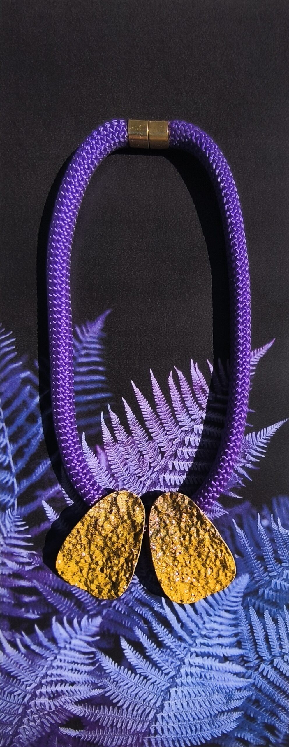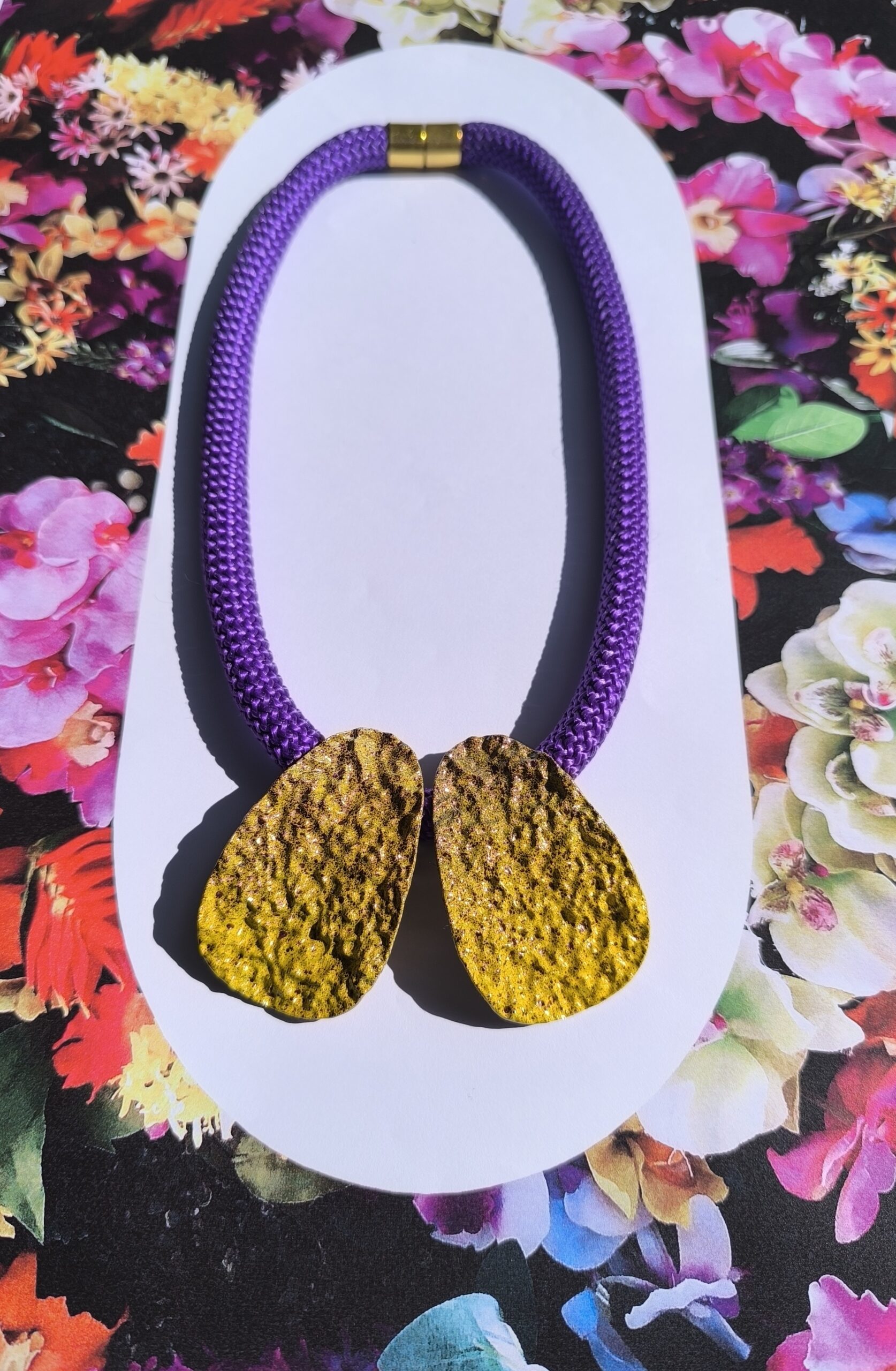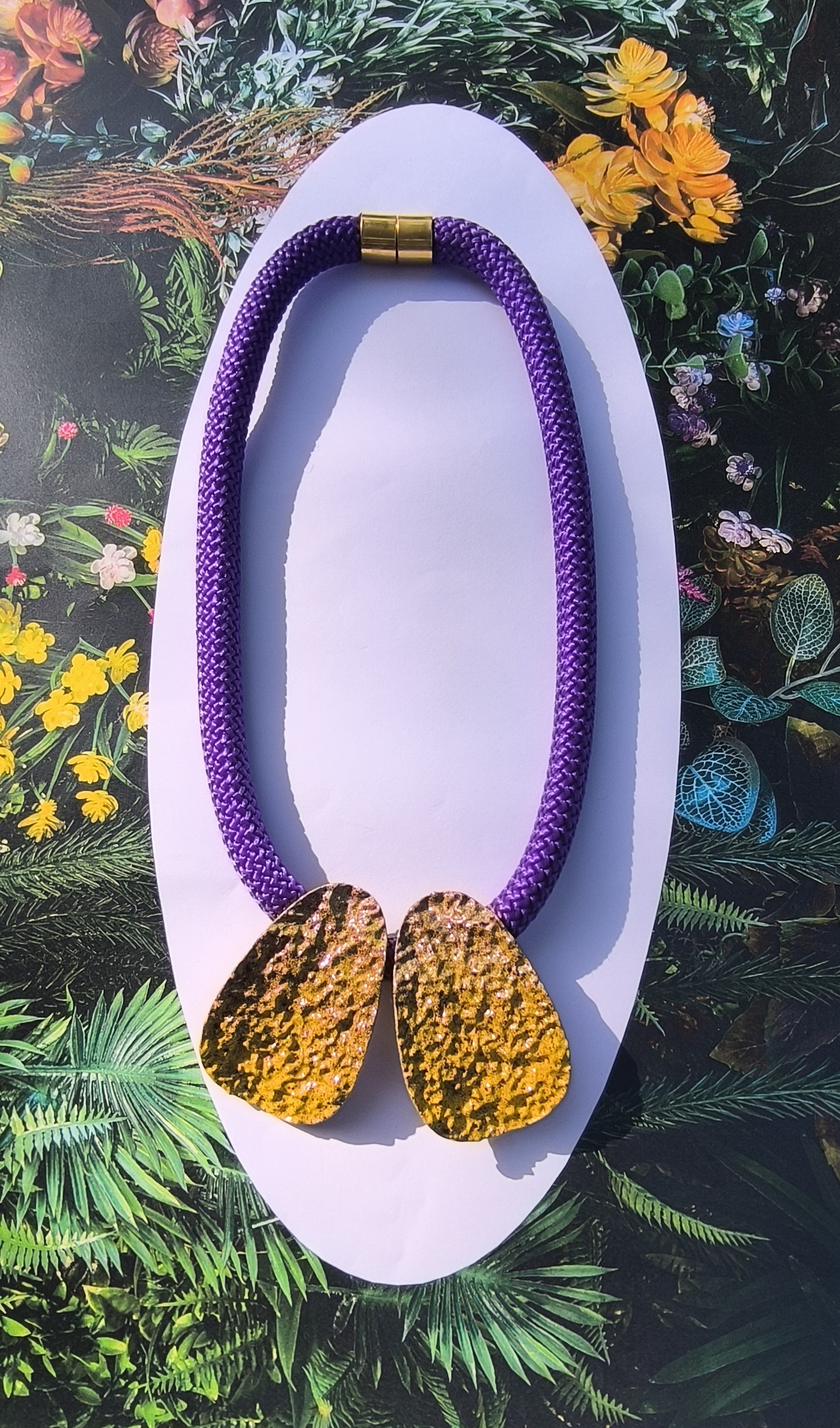 Elevate your neckline with a piece that balances sculptural volume with effortless wearability. It features a dynamic purple cord with two aluminium shell shaped pieces.Inspired by the greek sun and light, this necklace features forms that interact with light and shadow, transforming a simple silhouette into a bold work of wearable art.